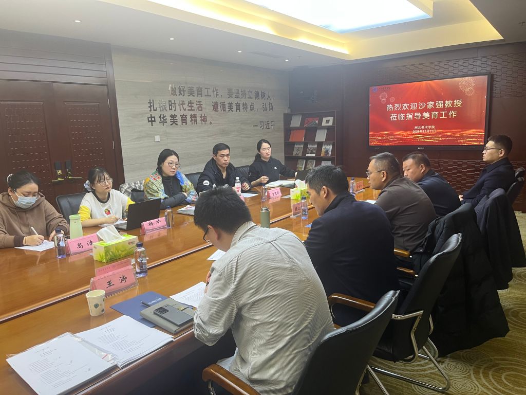 12月11日上午,河南财经政法大学沙家强教授应邀莅临河北美术学院,与基础教学部美育教研室全体教师围绕“美育课程建设与教学实践” 主题展开深度交流座谈。校党委副书记、副校长甄心恒出席座谈并指导工作,会议由基础教学部主任梁泽光主持,同时参会的还有马克思主义学院武笑笑副院长、学校图书馆馆长李世新。