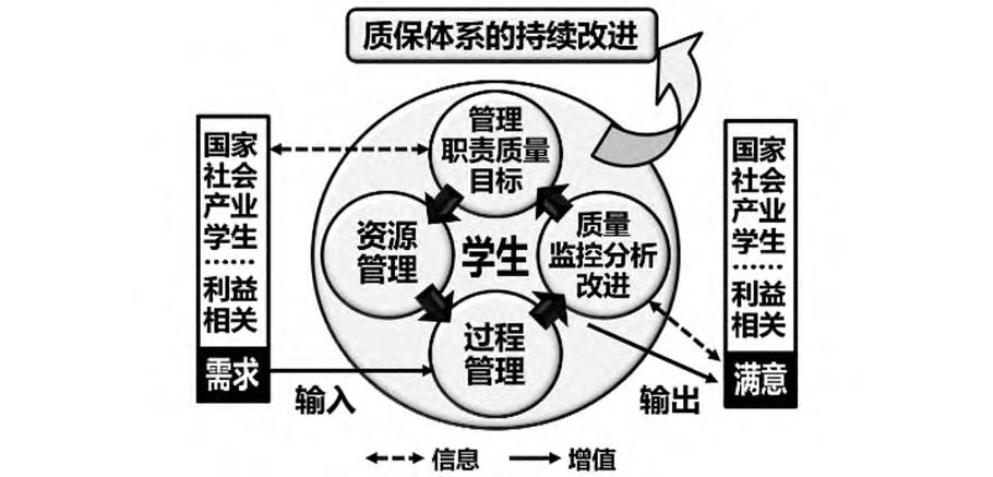 高校内部质量保障标准构建的理论基础是全面质量管理(Total Quality Management,TQM)。1961年美国通用电气公司总裁费根堡姆(Feigenbaum)首先提出全面质量管理概念,戴明(Deming)为代表的学者在日本推广使用并取得巨大成功,后来得到国际标准化组织ISO的关注,被1987年颁布的ISO9000系列标准全面采纳。格林伍德(Greenwood)等认为[4],全面质量管理同样适用于教育领域的质量保障。